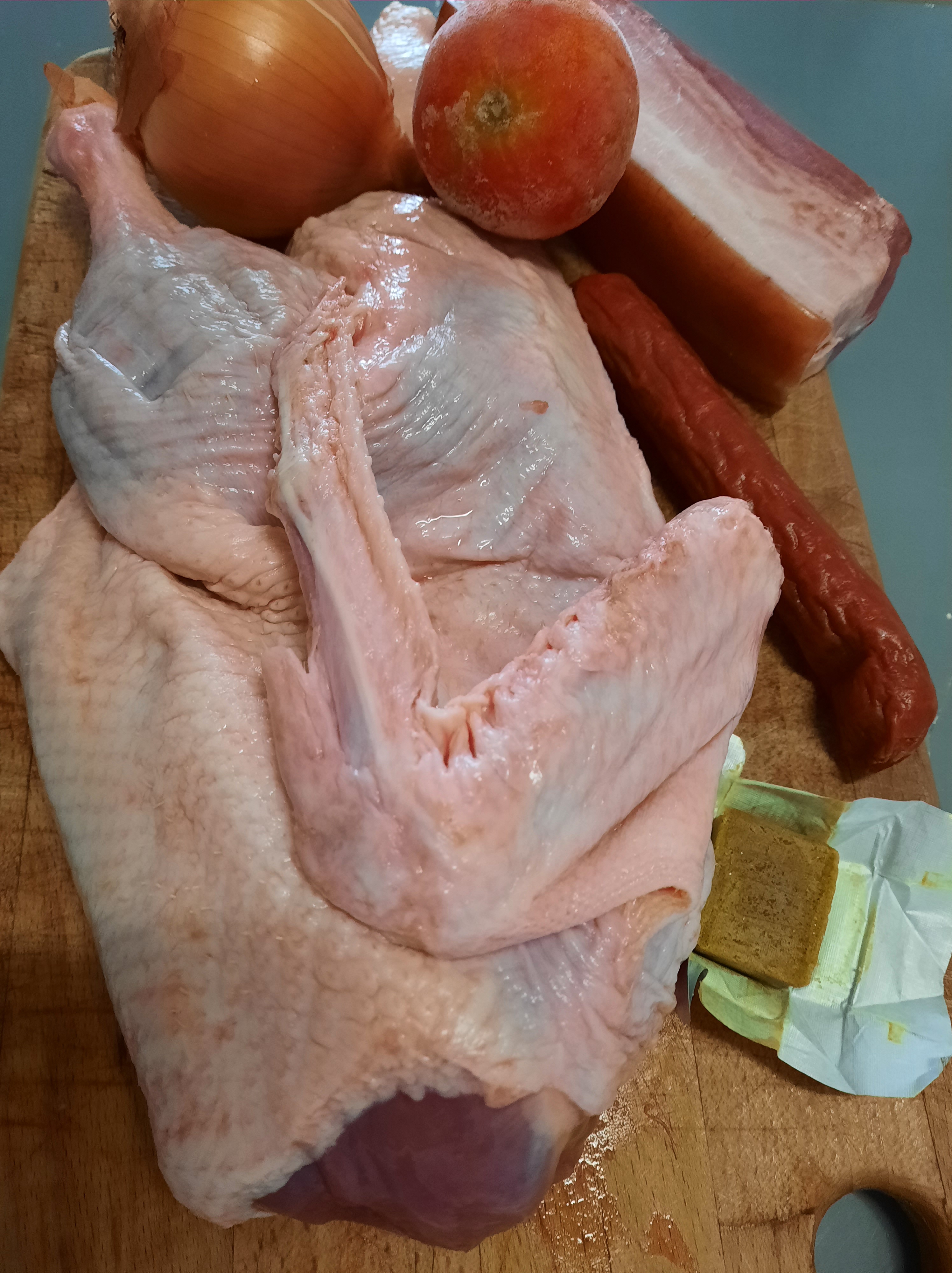 Arranje e coloque o pato num tacho, junte a cebola partida em quatro, o chouriço, o bacon, o tomate, o pimentão doce, os cominhos, o caldo de galinha, o vinho branco, o sal, adicione 2 L de água, tape o tacho, leve ao lume e deixe cozinhar até o pato ficar macio.