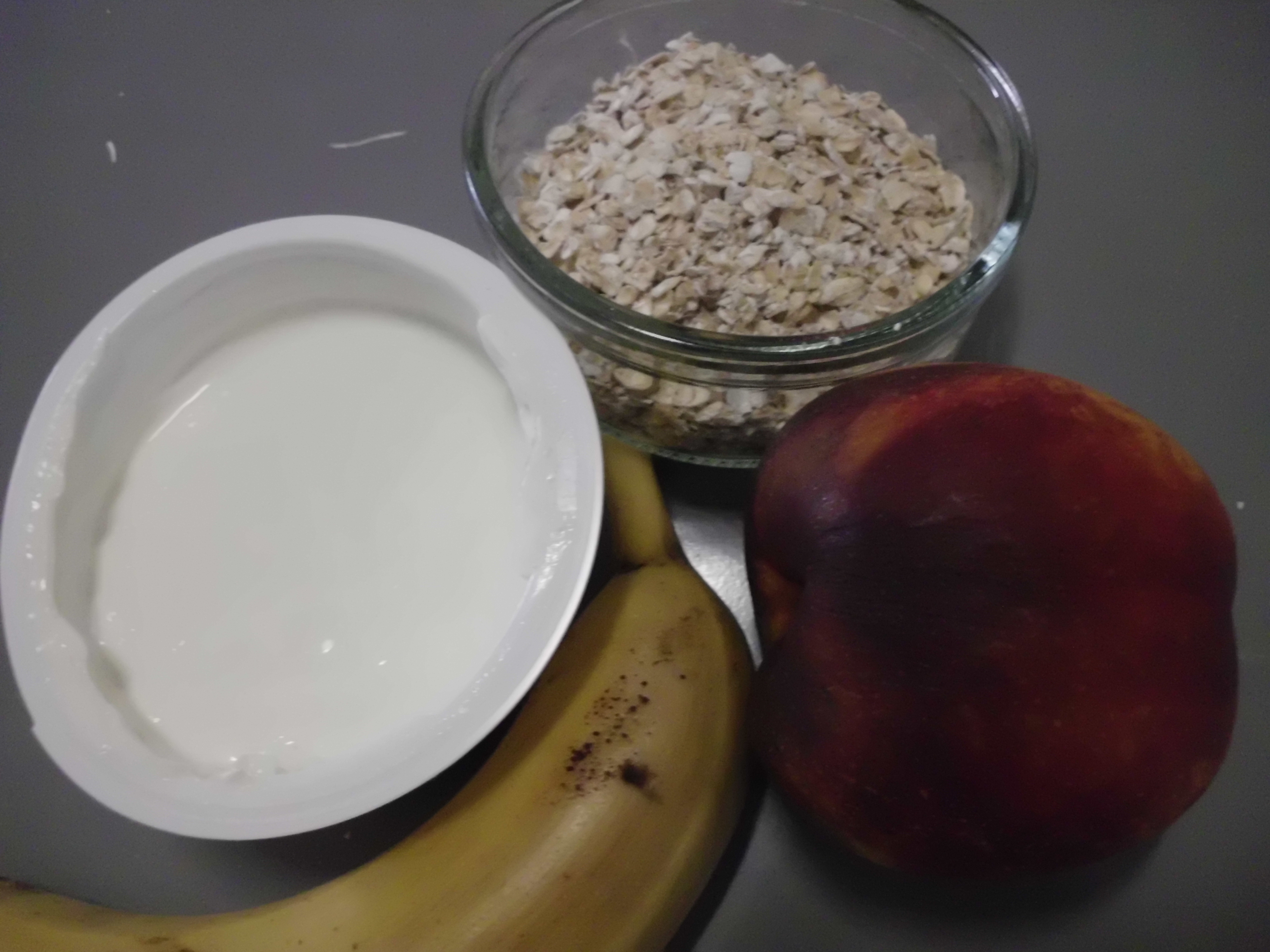Comece por descascar o pêssego, parta em gomos, descasque a banana, corte ás rodelas, a seguir, disponha num prato, a fruta, o iogurte, por fim polvilhe com flocos de aveia a gosto, e está pronto, delicie-se.