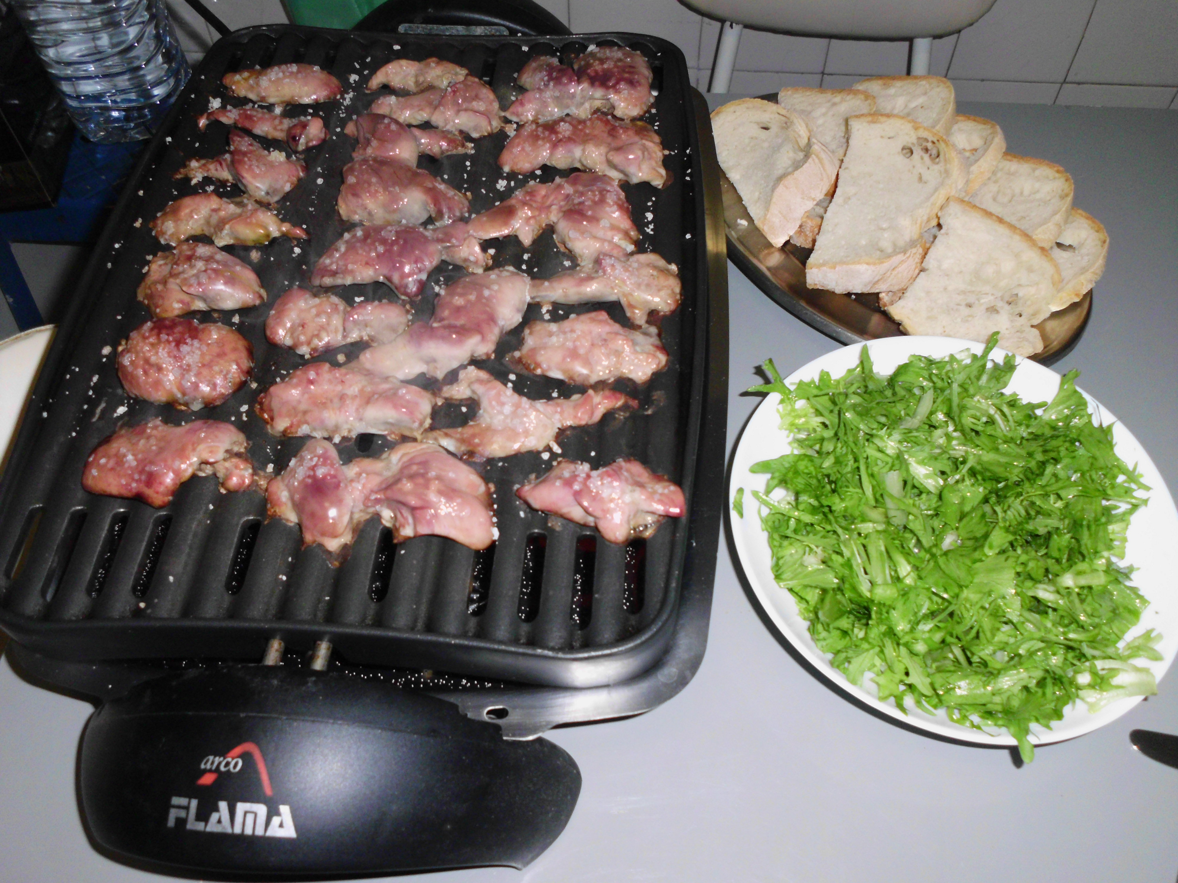 A seguir, disponha os fígados no grelhador, salpique de sal, deixe grelhar mas, de maneira que não fiquem muito secos. Repita o processo até estarem todos os fígados grelhados.