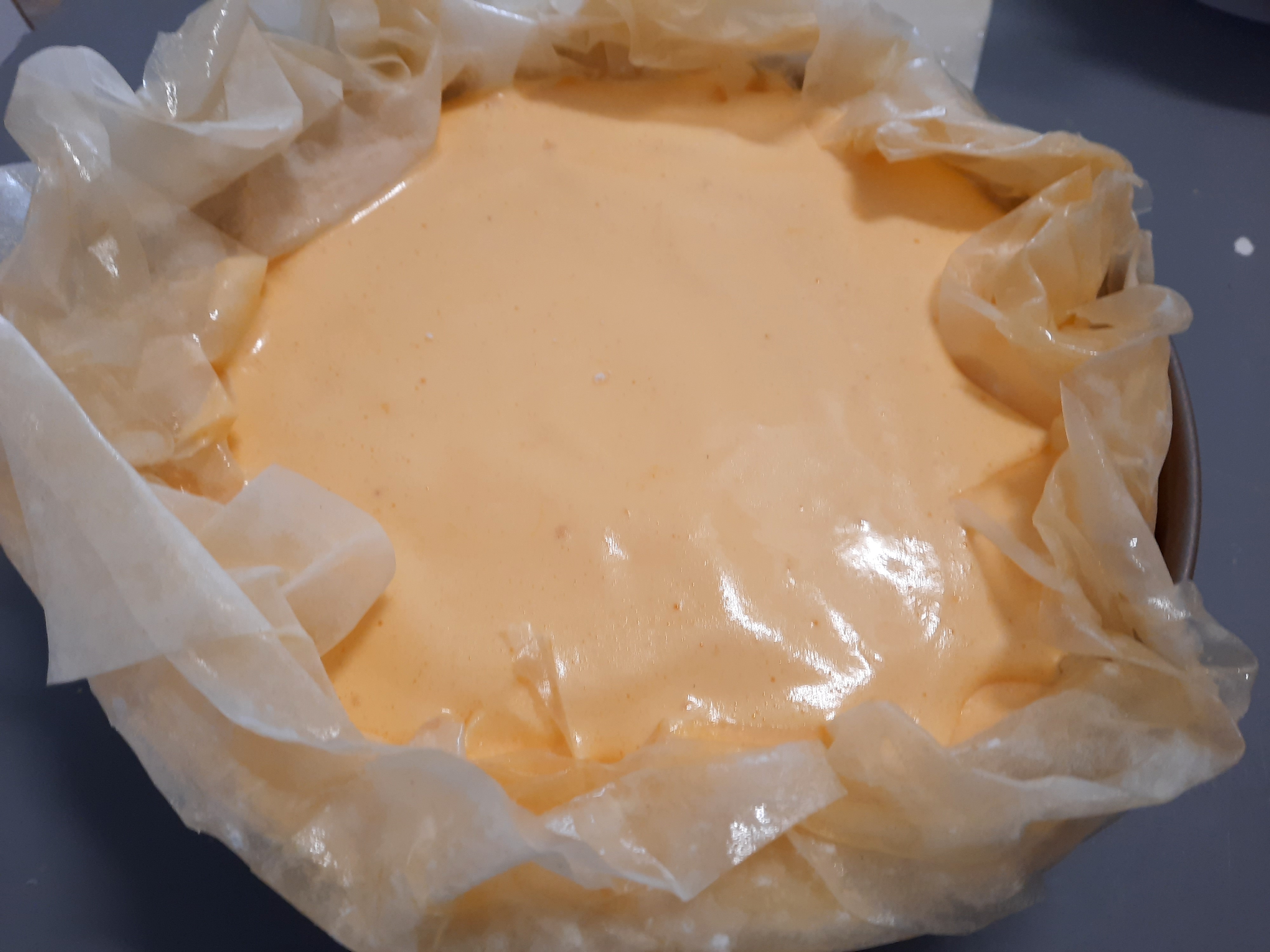 Unte uma forma de fundo amovível com manteiga, a seguir pincele com manteiga uma a uma as folhas de massa filo. A seguir forre a forma, tendo o cuidado de deixar um pouco de fora da forma.