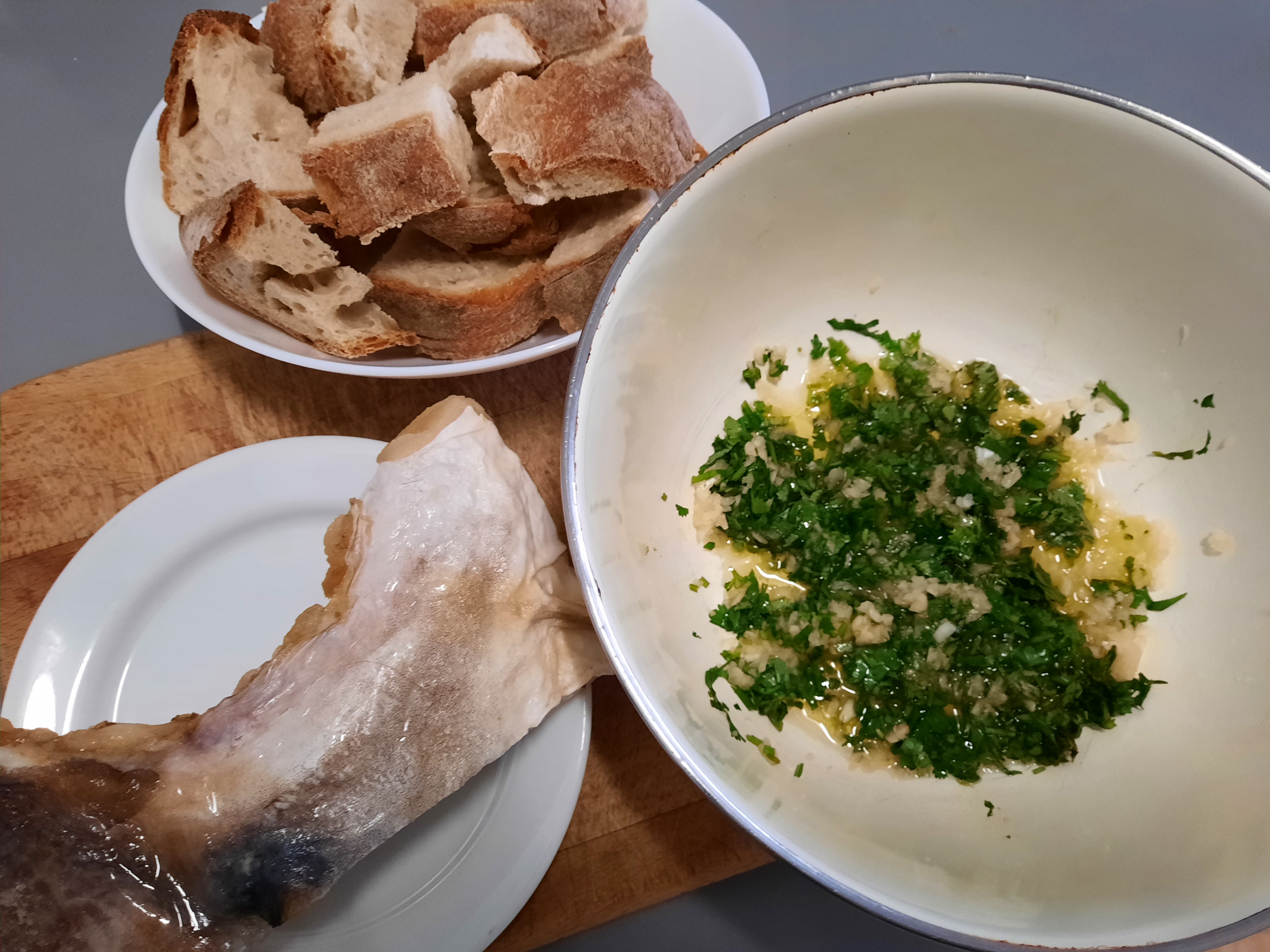 Numa tigela funda, coloque os alhos picados, os coentros picados, o pimento cortado ás tirinhas, o azeite, o sal. Depois deita-se por cima a água onde cozeu o bacalhau ainda a ferver, junte o pão fatiado.