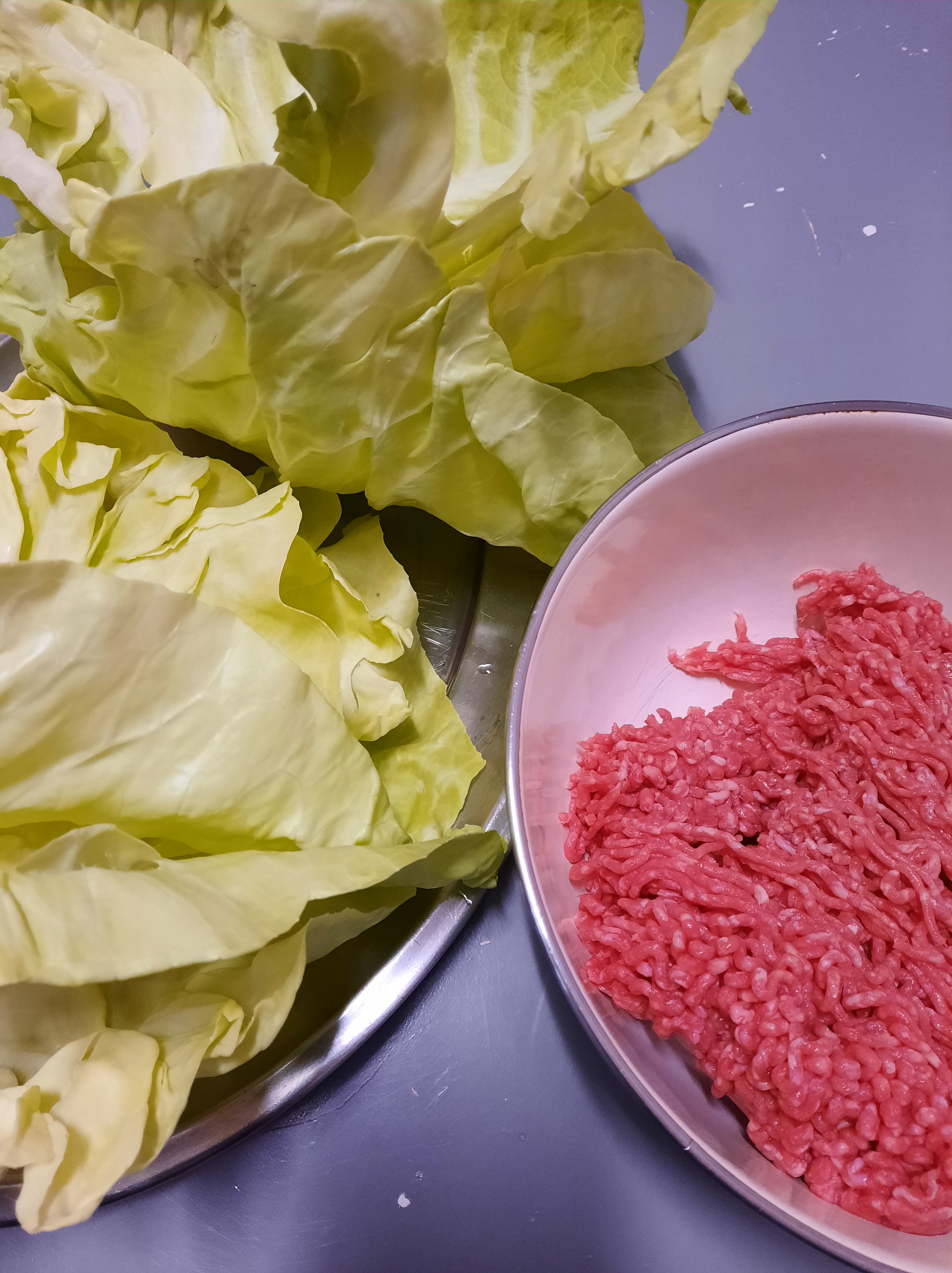 A seguir,recheie cada folha de couve com uma bola de carne, dobre a folha de forma a cobrir o recheio. Repita o processo para cada uma das folhas de couve.