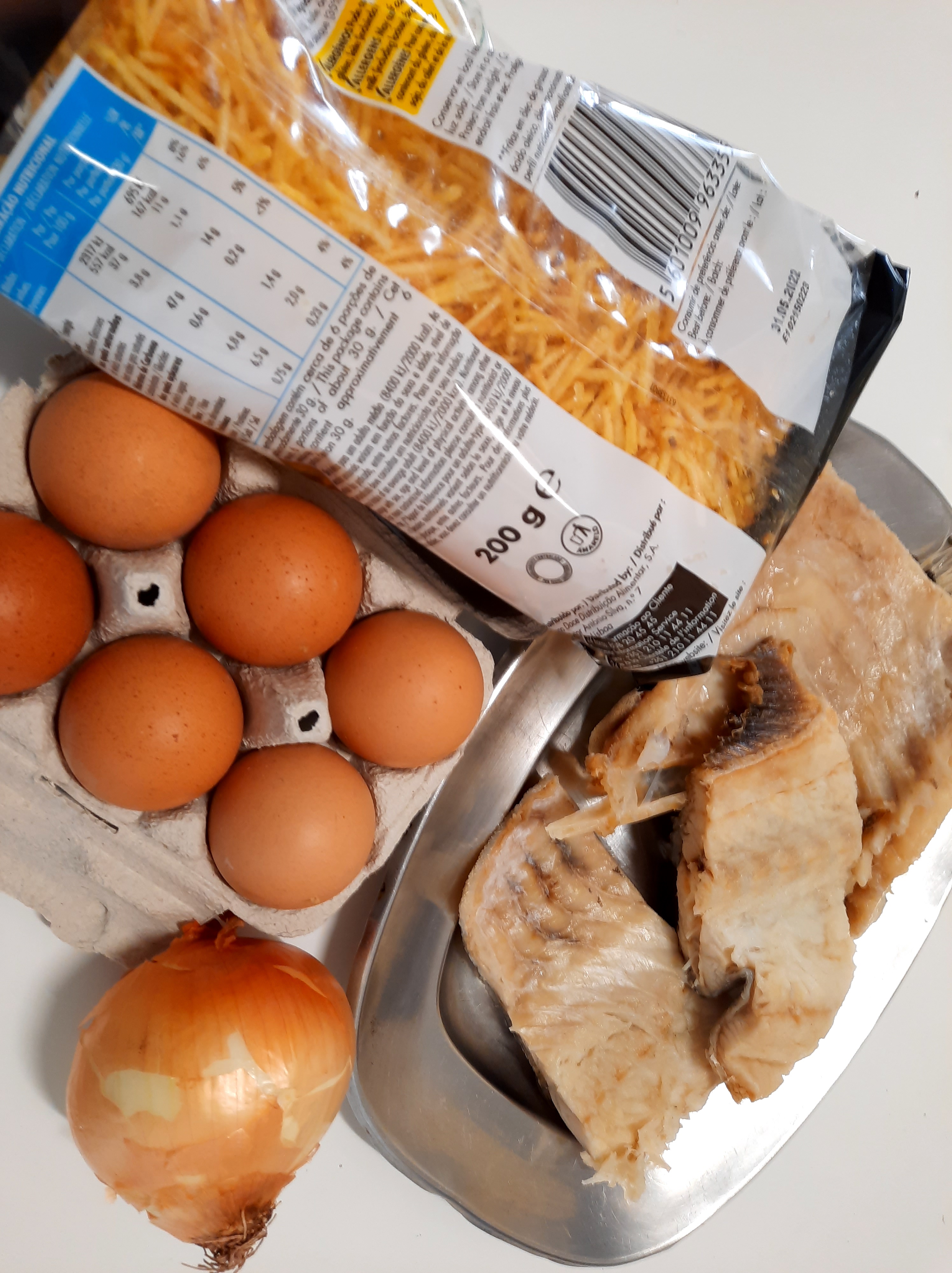 Num tacho, aqueça o azeite e refogue a cebola cortada ás meias luas fininhas até ficar transparente, junte o alho picado e o bacalhau desfiado, salteie durante 5 minutos, junte as batatas palha e envolva.