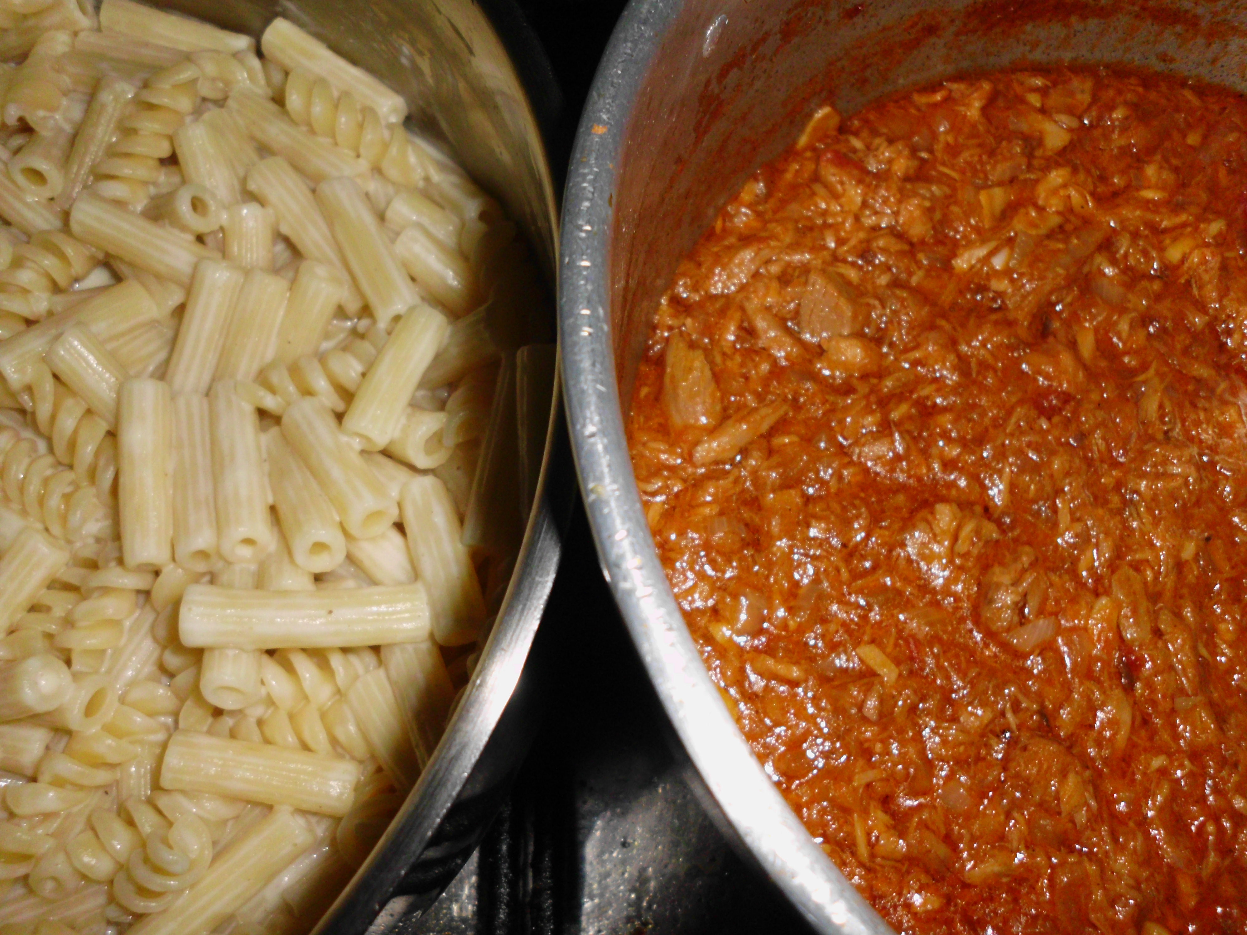 Num pirex fundo, coloque metade da massa, disponha por cima o atum, cubra com a restante massa, por fim distribua o molho por cima da massa, polvilhe com o queijo, leve ao forno a gratinar, a seguir sirva.