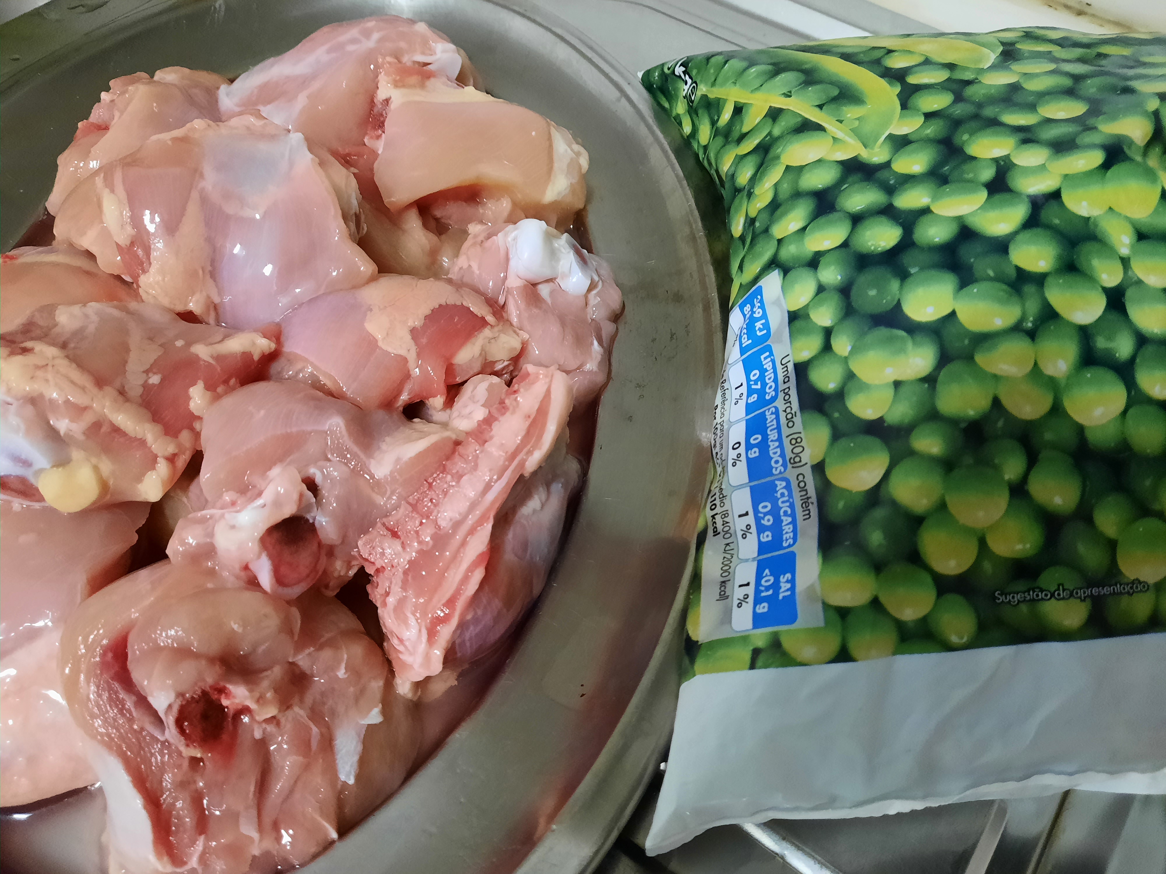 A seguir junte as ervilhas, mexa, retifique os temperos, tape o tacho e deixe cozinhar em lume brando durante 25 minutos. Retire do lume, polvilhe com coentros, sirva acompanhado com arroz branco.