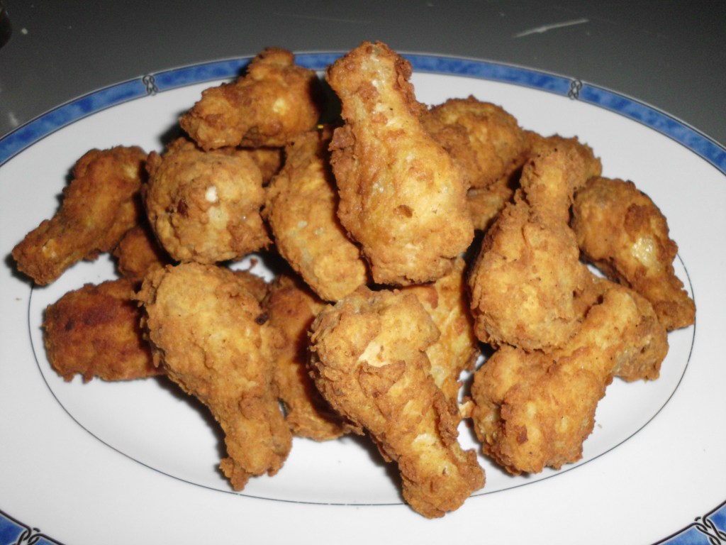 Frite as asas de frango até ficarem douradas, não as frite todas de uma vez, escorra-as sobre papel absorvente, sirva acompanhadas com salada.